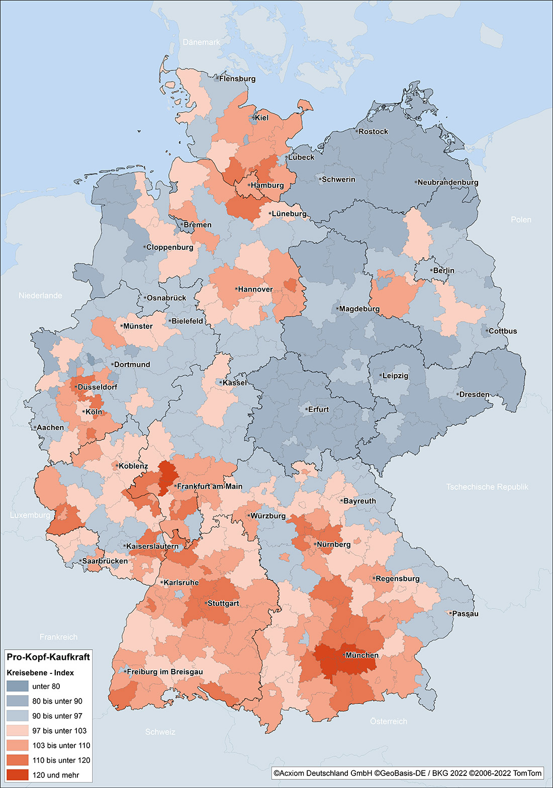Für das Jahr 2022 berechnete Acxiom für Deutschland eine Pro-Kopf-Kaufkraft von 25.044 Euro je Einwohner – Dies bedeutete eine Steigerung von 632 Euro pro Kopf gegenüber dem Vorjahr. Die Gesamtkaufkraft stieg um 2,6 Prozent auf ca. 2.101,9 Mrd. Euro.