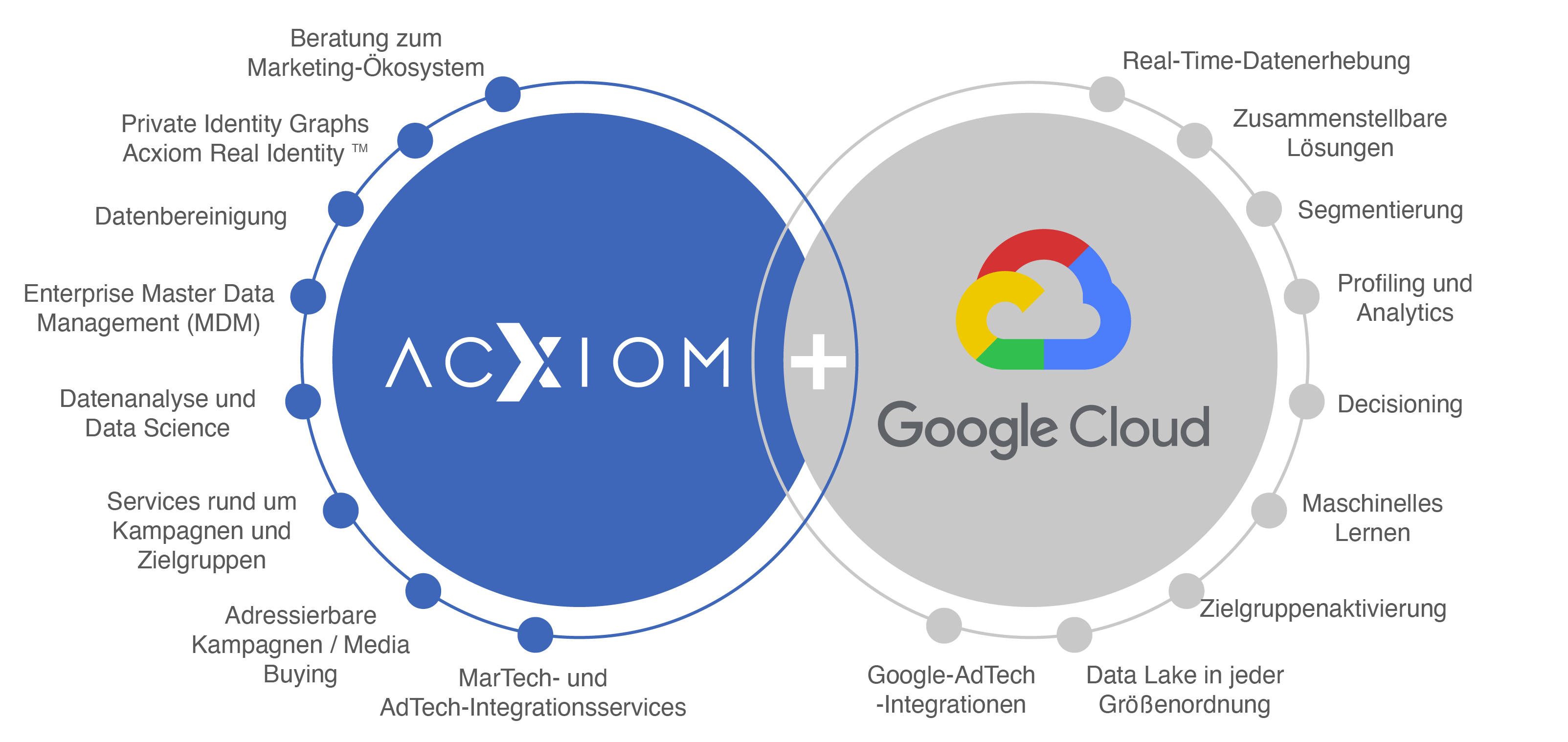 Da Acxiom seine Datasets und Lösungen in Google Cloud bereitstellt, können unsere Kunden ganz einfach auf große Datenmengen zugreifen und diese verwalten. Dank Cloud-Funktionen bei Data Blending, KI und Analytics können sie dann alles aus ihren Daten herausholen.