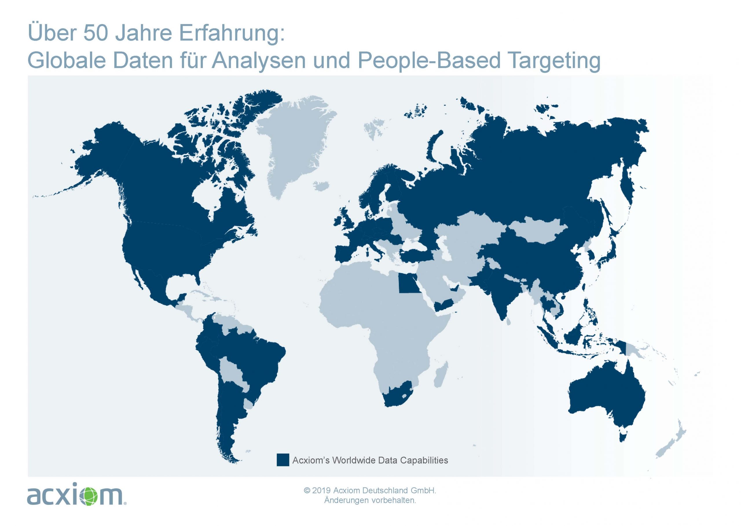 Acxiom ist ein führender Datendienstleister und ermöglicht People-Based Marketing über alle relevanten On- und Offlinekanäle und den Single Customer View. Acxiom macht Daten und Insights einfach und sicher nutzbar, überall dort, wo sie benötigt werden. Immer mehr Endgeräte und Kanäle erzeugen eine Vielzahl von Daten, die häufig in Datensilos verschiedener Unternehmensbereiche landen. Somit werden aktuelle und künftige Kunden oft mit irrelevanten, nicht zielgerichteten Marketingbotschaften adressiert. Acxiom unterstützt weltweit Werbetreibende und Partner, gemeinsam diese Herausforderung zu meistern. Seit über 55 Jahren ist Acxiom führend in der verantwortungsvollen Nutzung von Daten.