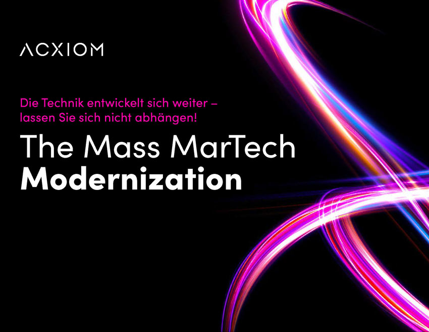 „MarTech-Optimierung auf dem Vormarsch: Ein Upgrade Ihrer Marketingtechnologie ist jetzt eine Notwendigkeit – doch worauf kommt es an?“ wurde von Acxiom in Zusammenarbeit mit dem globalen Marktforschungsunternehmen MTM realisiert. Befragt wurden in den USA und Großbritannien 200 erfahrene Marketing- oder IT-Führungskräfte, zu deren Aufgabenbereich MarTech zählt.