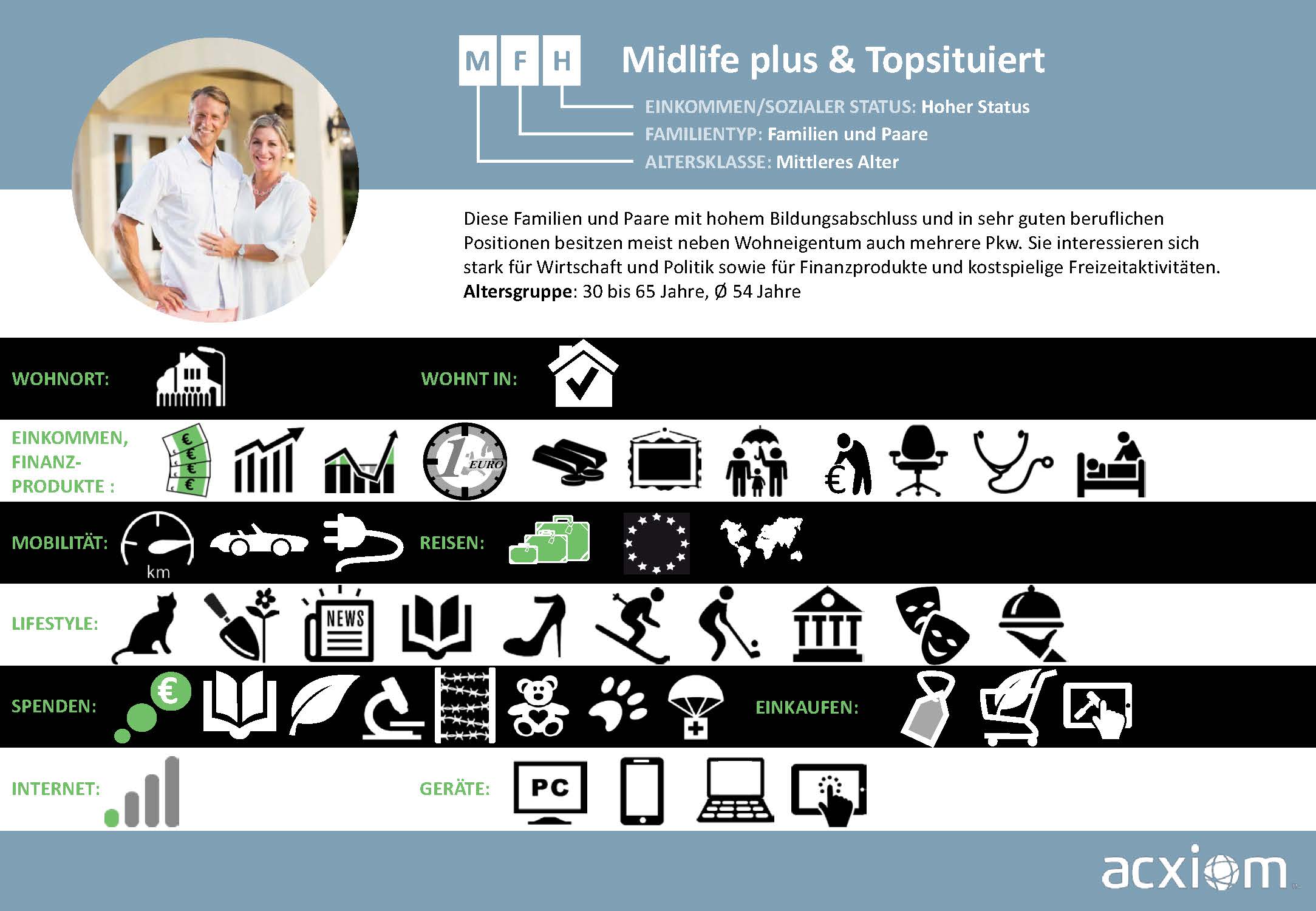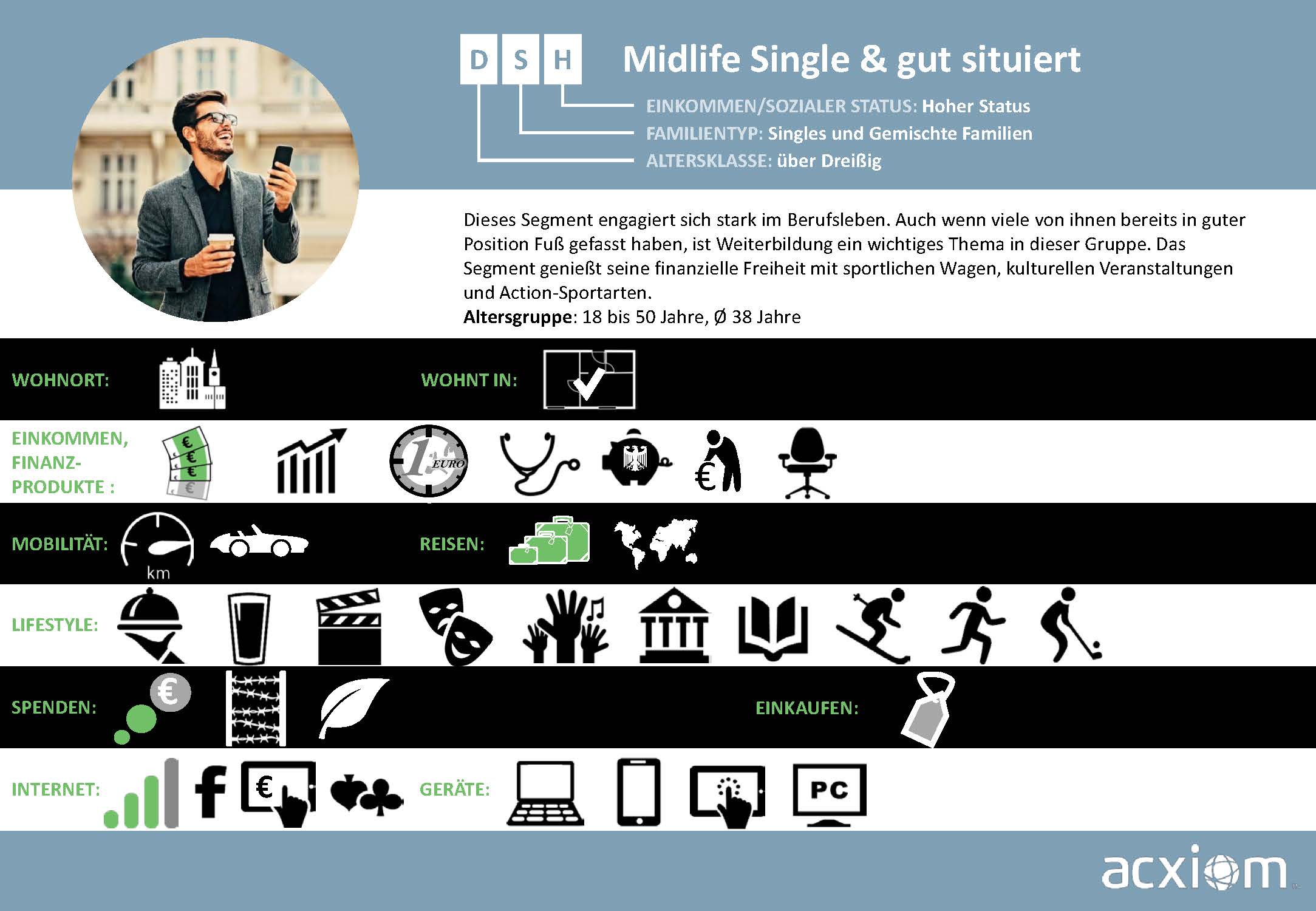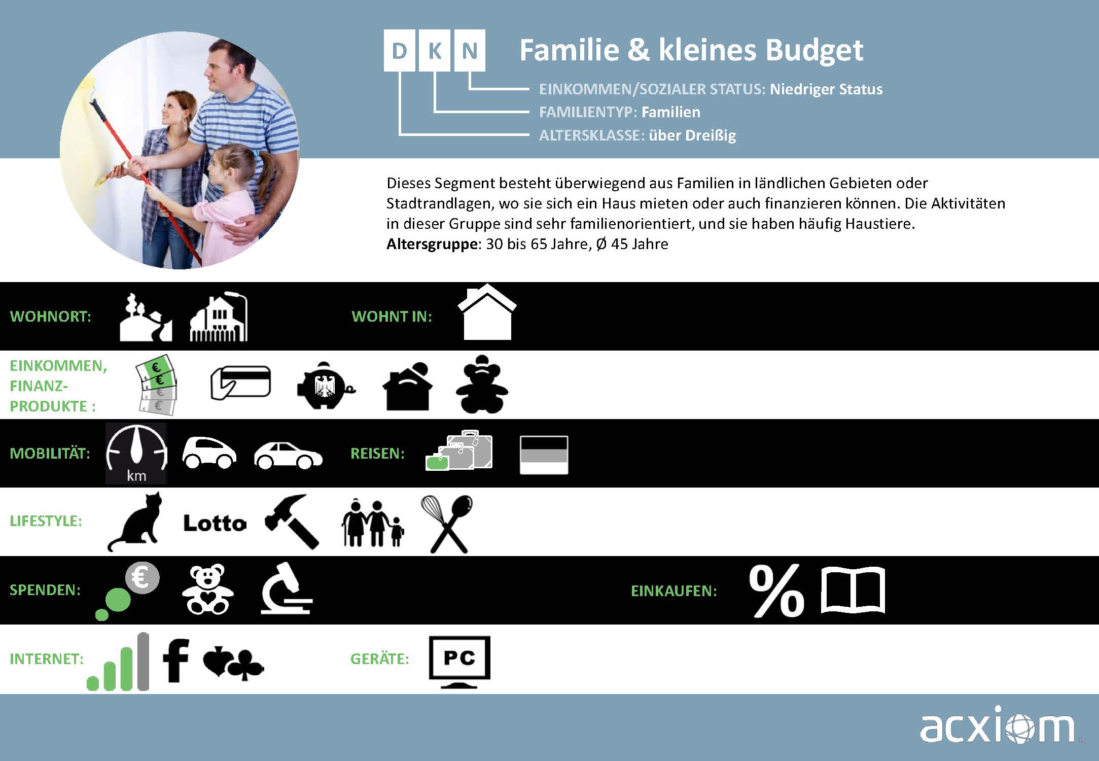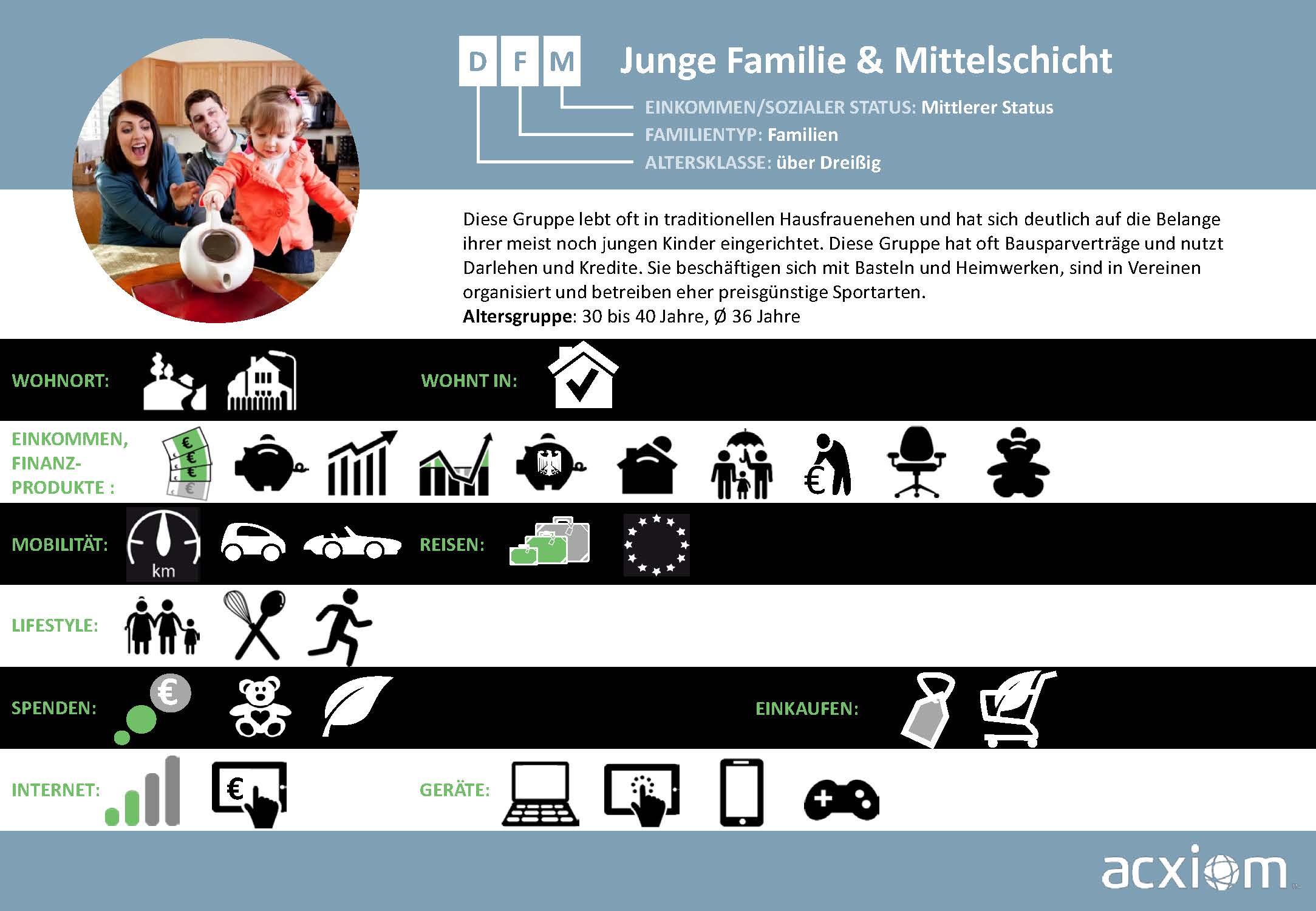 Aus diesen Quellen generiert Acxiom Wissen, das Märkte und Zielgruppen umfassend beschreibt und Streuverluste bei der Ansprache von Verbrauchern minimiert. Diese breitgefächerten Informationen zu Soziodemografie, Sozioökonomie und Konsumaffinitäten sind die Basis für ein bewährtes, zielgruppengenaues Targeting, das nahtlos in die Onlinewelt übertragbar ist.