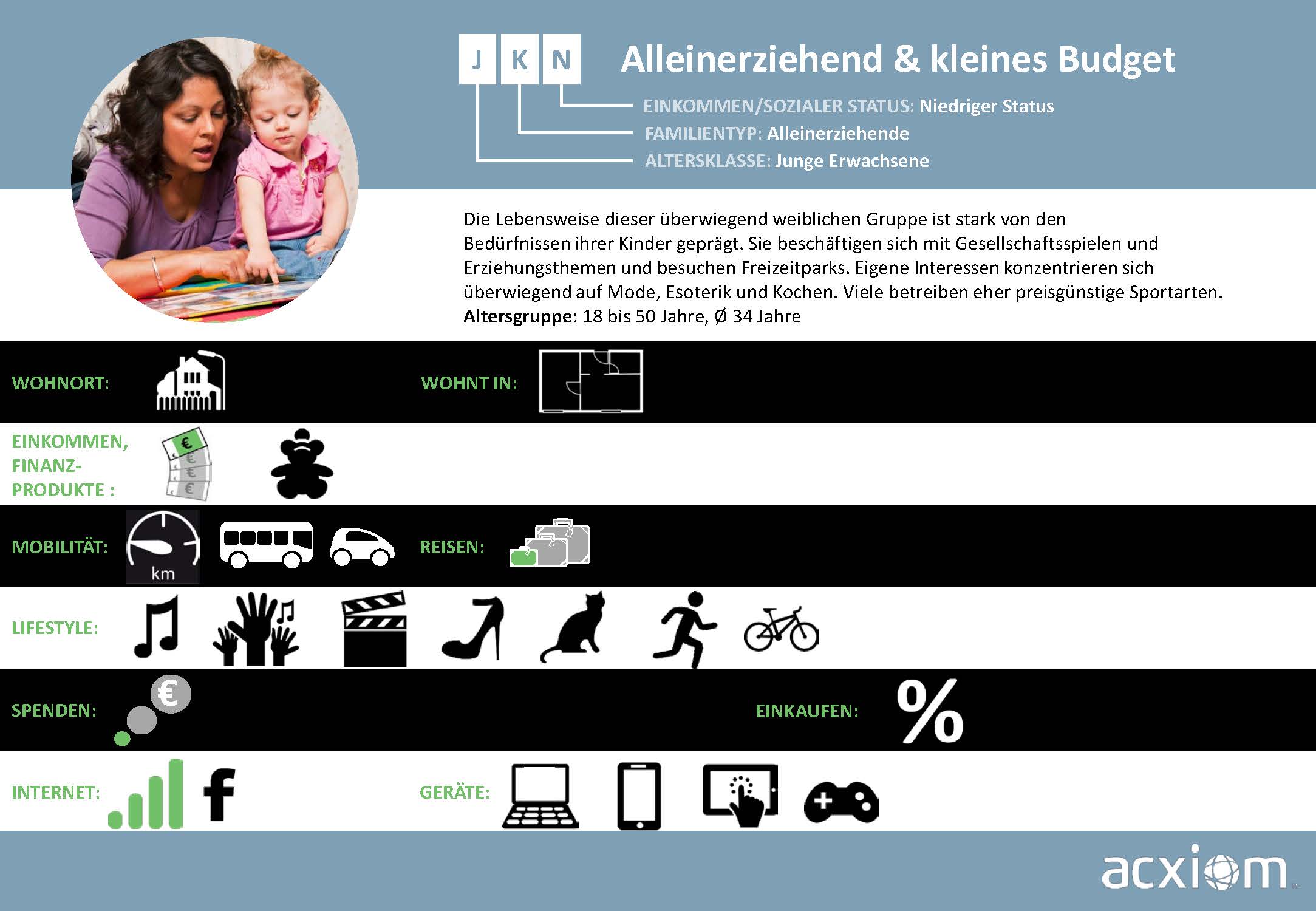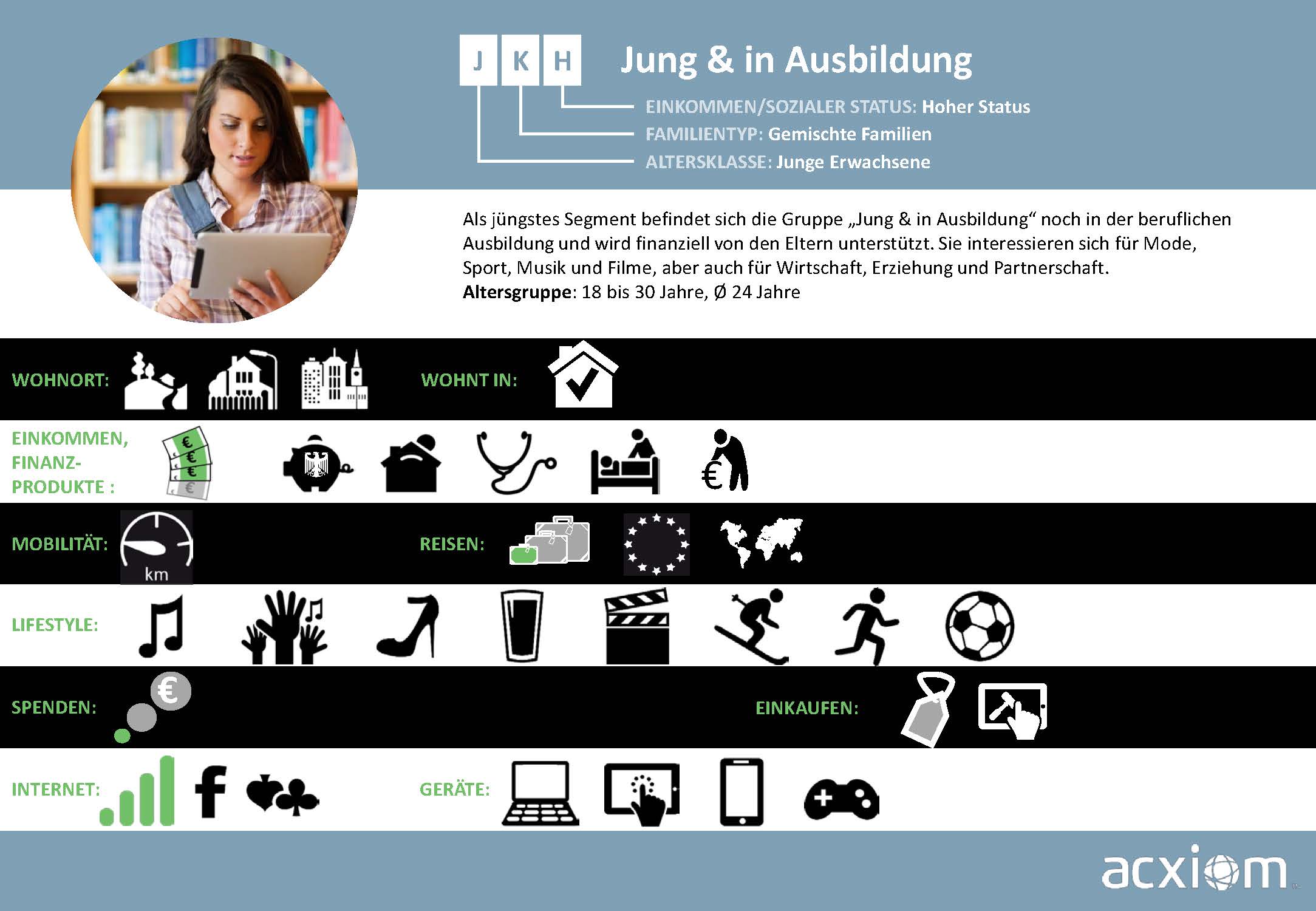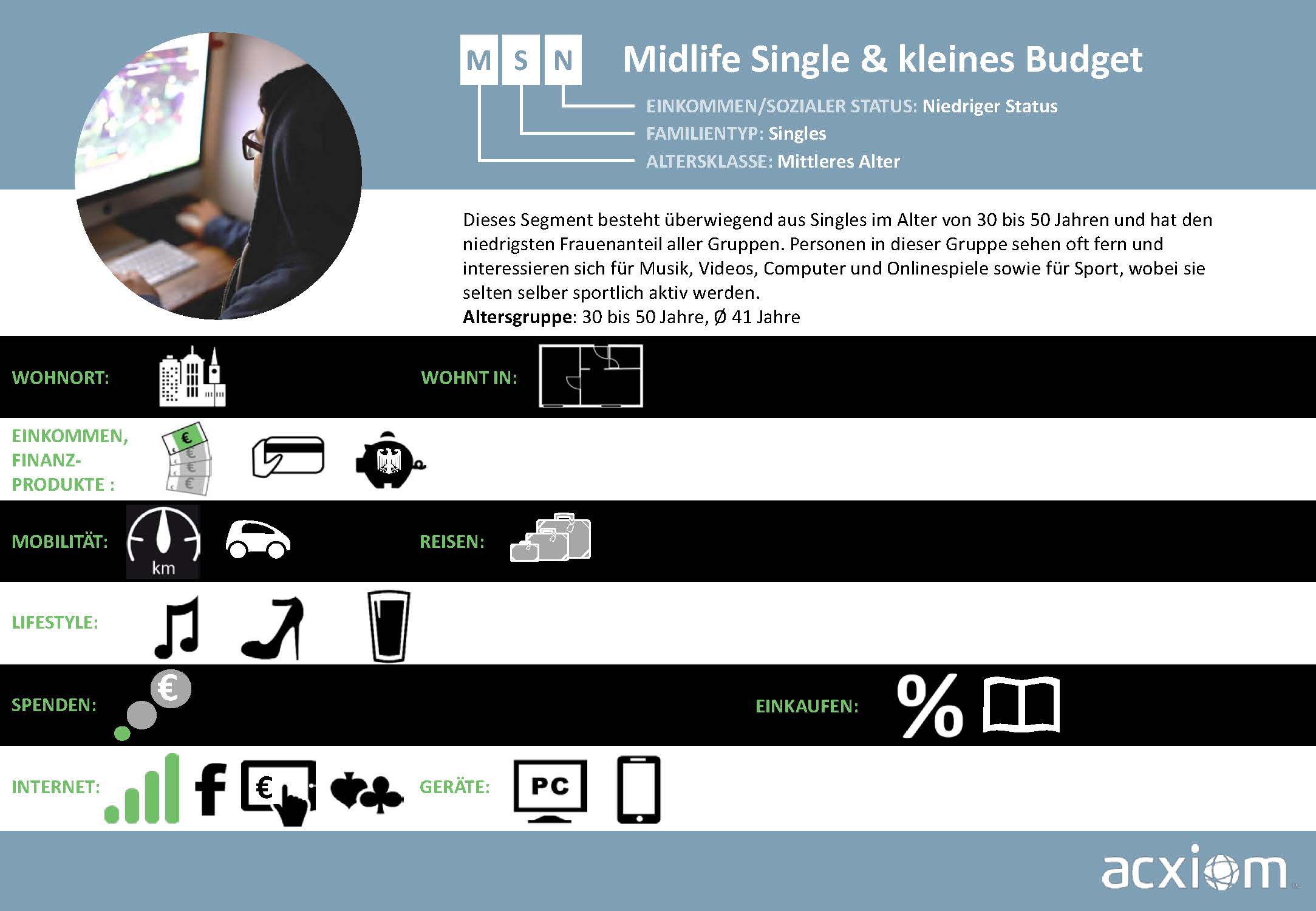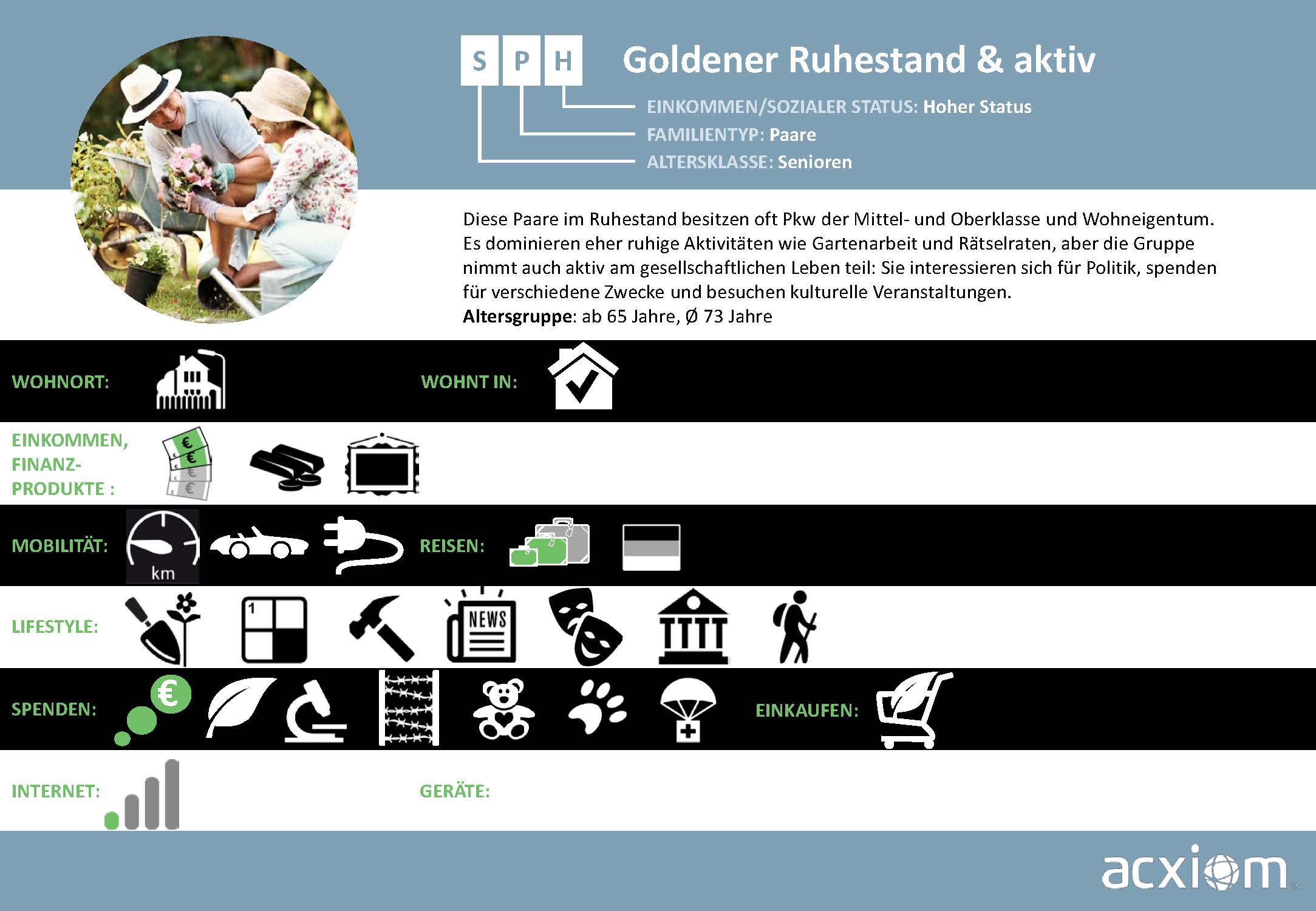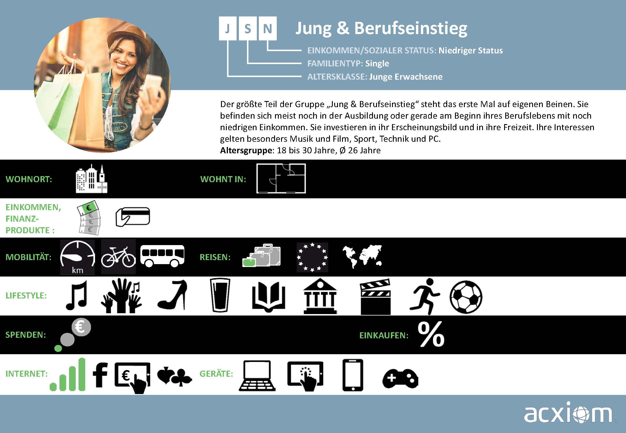 Aus diesen Quellen generiert Acxiom Wissen, das Märkte und Zielgruppen umfassend beschreibt und Streuverluste bei der Ansprache von Verbrauchern minimiert. Diese breitgefächerten Informationen zu Soziodemografie, Sozioökonomie und Konsumaffinitäten sind die Basis für ein bewährtes, zielgruppengenaues Targeting, das nahtlos in die Onlinewelt übertragbar ist.
