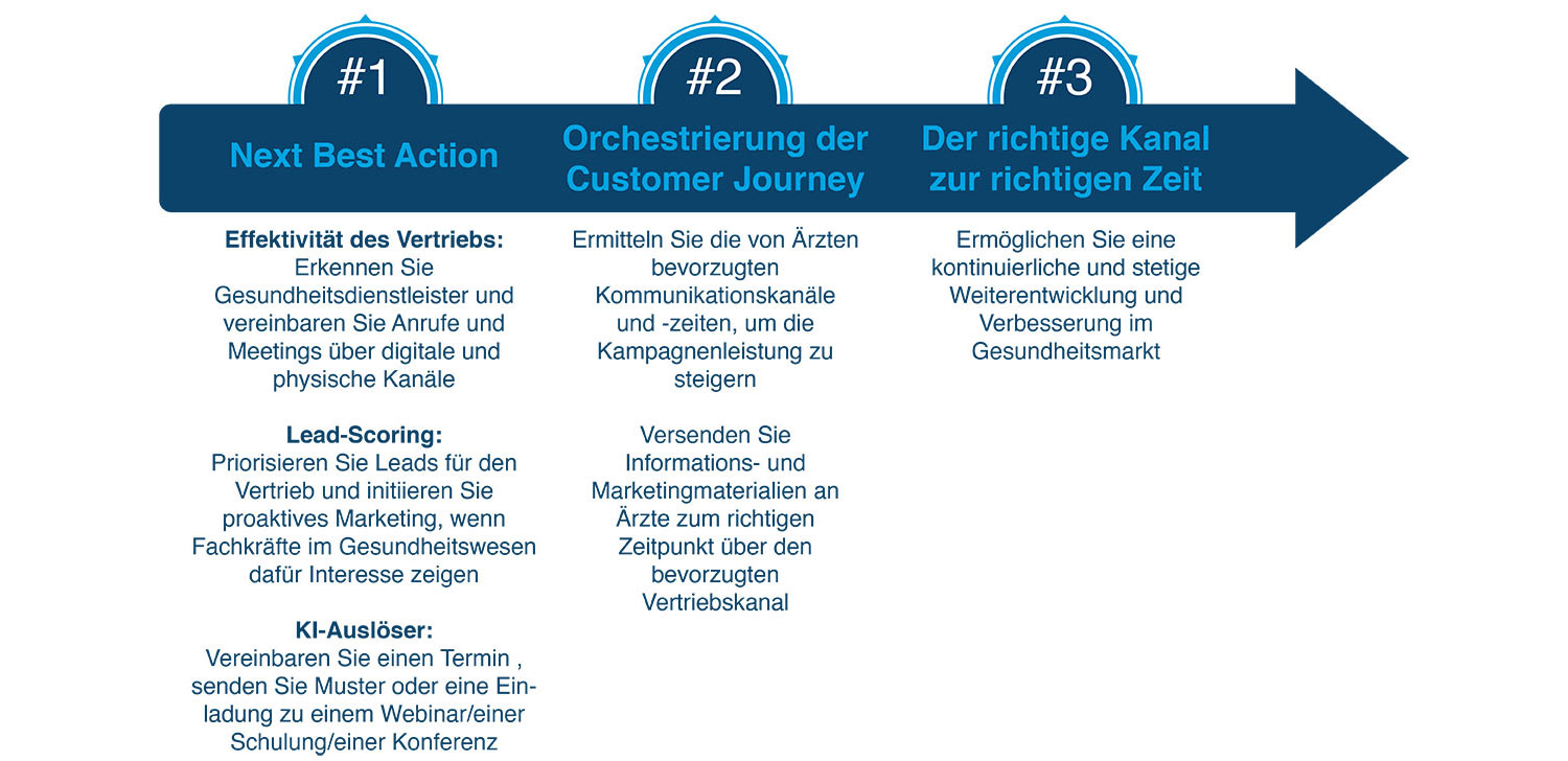 Diese Strategien ermöglichen es Pharmaunternehmen, auf Kundenverhalten zu reagieren und eine zeitnahe, individuelle Kommunikation zu liefern. Dies bietet eine gute Möglichkeit für Unternehmen, mit ihren Kunden effektiv während ihrer ganzen Customer Journey zu kommunizieren.