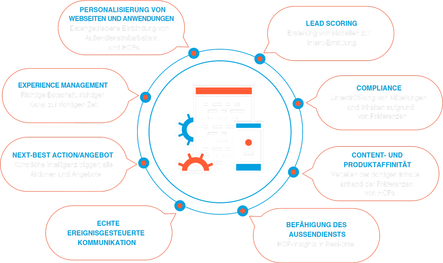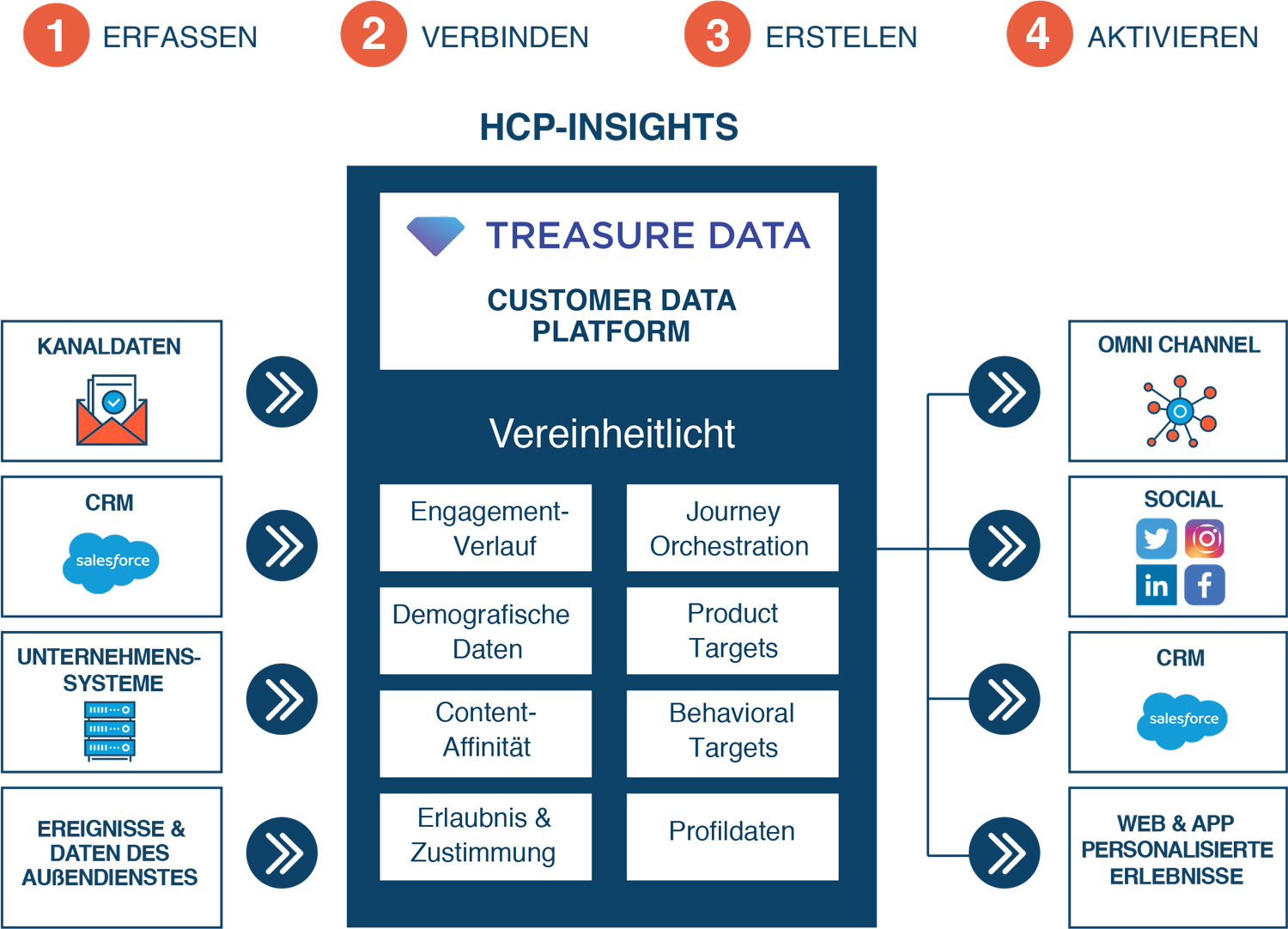HCP-Engage kombiniert Data Intelligence und Implementierungsdienste von Acxiom mit einer für diese Zwecke entwickelten Customer-Data-Plattform. Neben einer Zusammenführung von Kundendaten erfolgt hier eine Kundenmodellierung mit einer Lookalike- und ResponseModellierung. Grundlage ist die Kombination von Daten aus der Kundendatenplattform mit Informationen über die Praxen, vergangene Transaktionen und Engagements sowie demografische Daten und Interessen der HCPs. Durch Funktionen des Datenmanagements werden alle Kundendaten-Events erfasst und eine Personalisierungsstrategie entwickelt. Weitere Aspekte des eigenen Modells zielen auf die Identity-Funktionalität der Kundendatenplattform und die Möglichkeit von Analysen in Kombination mit verfügbaren First-, Second- und Third-Party-Daten.