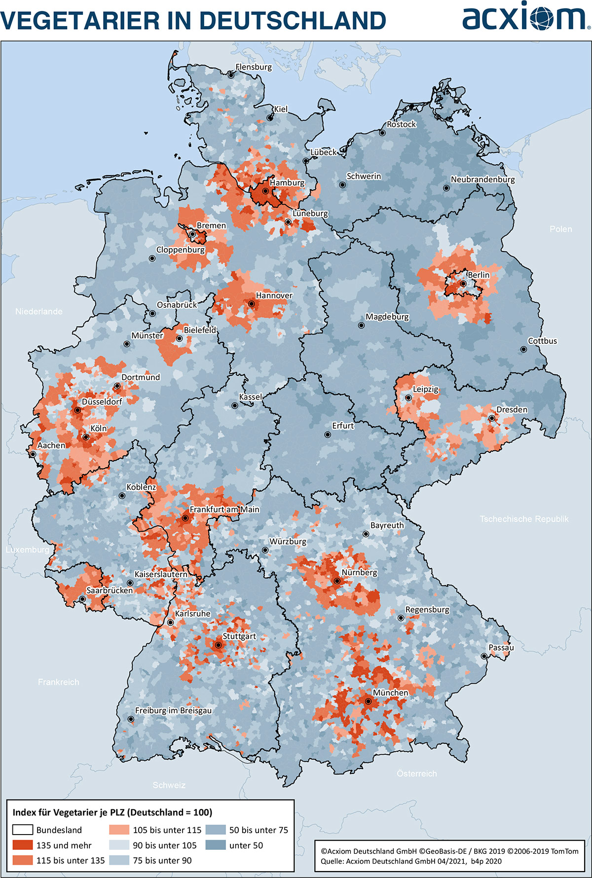 „Auch wenn sich Veganer und Vegetarier in vielen Punkten ähneln, zeigen sich dennoch einige, teilweise enorme Unterschiede zwischen beiden Zielgruppen“, so Christian Kanhäußer, Team Leader Analytics bei Acxiom. „Dieses Prinzip lässt sich auf viele weitere Zielgruppen anwenden und zeigt deutlich, wie wichtig eine möglichst genaue Bestimmung der Adressaten mit allen Details ist, wenn Marketingaktivitäten funktionieren und nicht ins Leere laufen sollen.“